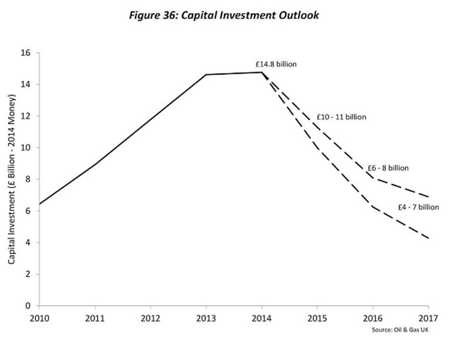 A report released by the UK industry yesterday reveals that capital investment in the British North Sea area will have halved in two years, with investment in the region plummeting by between £2 billion and £4 billion a year over the next three years.