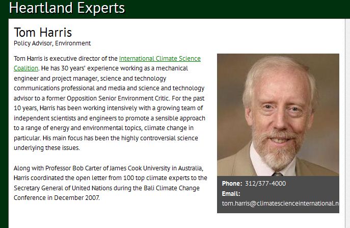 Richard Littlemore explains more of Harris’ background on DeSmogBlog: “Tom Harris, who originally trained as a mechanical engineer, has been a strategist for the climate change denial industry for at least a decade. A favourite presenter misrepresented as a PhD at the Heartland Institute’s regular climate change denial conferences, Harris has worked directly for companies like the international PR giant APCO Worldwide or for energy industry lobby firms such as Toronto’s High Park Group. More recently, he has launched or led at least three phony “grassroots organizations” – energy industry front groups that promote confusion or denial in climate science.”