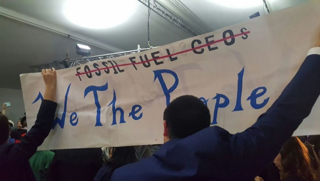 Collin Rees, a campaigner from Oil Change International, who was in the room, tweeted: “Protestors just shut down U.S.-sponsored event on “clean fossil fuels” at #COP23 – hundreds of people streaming out, singing & chanting. Room is nearly empty now that they’re gone! #WeThePeople”