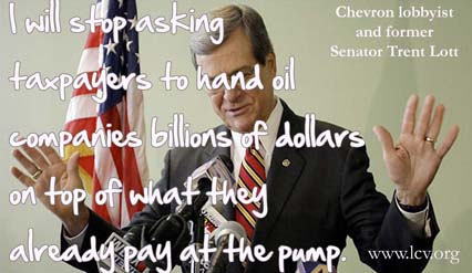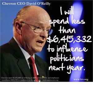 Our particular favourites are on this blog – the one where Chevron CEO David O’Reilly says “I will spend less than $6,4515,322 to influence politicians next year” and Chevron lobbyist and former Senator Trent Lott says: “I will stop asking taxpayers to hand oil companies billions of dollars on top of what they already pay at the pump”.