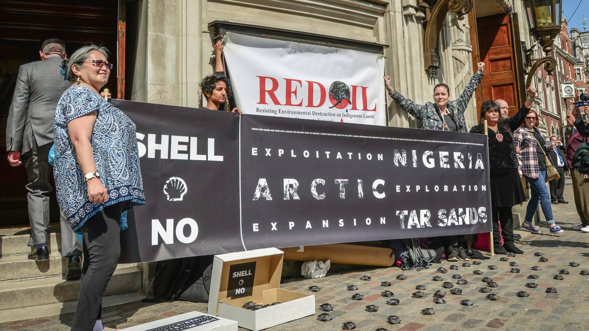One of the banners which protesters unfurled outside Shell’s AGM last week highlighted three of Shell’s most contentious issues of the moment: Exploitation in Nigeria: Arctic exploration and expansion of the tar sands.