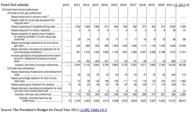 This budget request, which was basically ignored by Congress, would have eliminated $36.5 billion in oil and gas subsidies and $2.3 billion in coal subsidies over the next 10 years. If you’re interested to get detail on the line items, you should read the US submission to the G20 subsidy removal process, which goes through each of these lines in detail.