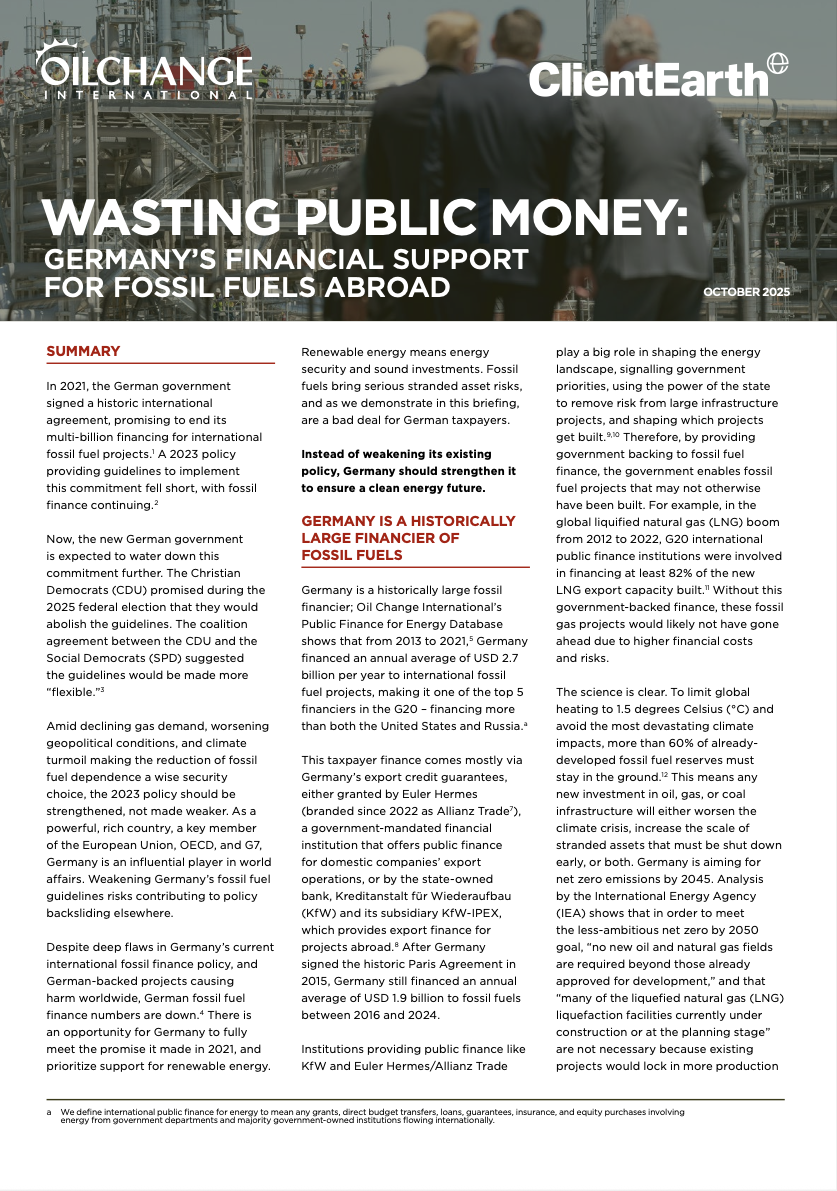 Research released today by Oil Change International and ClientEarth, Wasting Public Money, reveals how Germany is at risk of watering down a 2021 pledge to end taxpayer-backed financing of fossil fuel projects overseas. It outlines Germany’s long-term international role as a significant backer of fossil fuel projects overseas, sounds the alarm that the German coalition may soon seek to weaken their guidelines restricting international fossil fuel finance, and reveals that Germany is considering nearly EUR 1.2 billion in support for overseas fossil fuel projects.