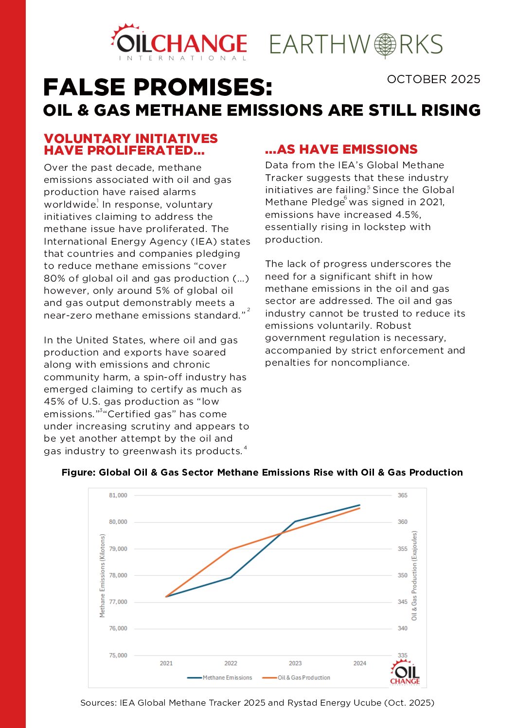 Over the past decade, methane emissions associated with oil and gas production have raised alarms worldwide. In response, voluntary initiatives claiming to address the methane issue have proliferated. The “False Promises: Oil and Gas Methane Emissions Are Still Rising” factsheet shows that these initiatives are failing to reduce emissions of the climate pollutant methane. Emissions have increased 4.5%, essentially rising in lockstep with production, since the Global Methane Pledge was signed in 2021, according to data from the International Energy Agency’s Global Methane Tracker.